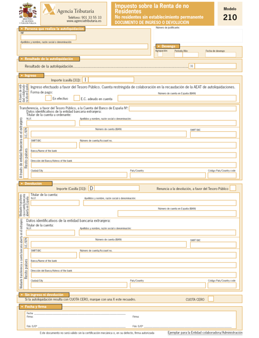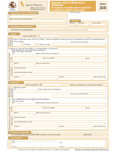 Nichtresidente Immobilienbesitzer in Spanien sind gesetzlich verpflichtet, eine Einkommenssteuer auf die Eigennutzung der Immobilie über das Formular 210 bis zum 31.12. des Folgejahres an das spanische Finanzamt abzuführen. Für jede Immobilie (d.h. pro Grundsteuerbescheid) ist eine eigene Erklärung abzugeben. Bemessungsgrundlage ist der Katasterwert, der dem jährlichen Grundsteuerbescheid entnommen wird. Das entsprechende Steuerformular "Modelo 210" ist online auszufüllen. Gerne erledigen wir für Sie die Abgabe dieser Steuererklärung.